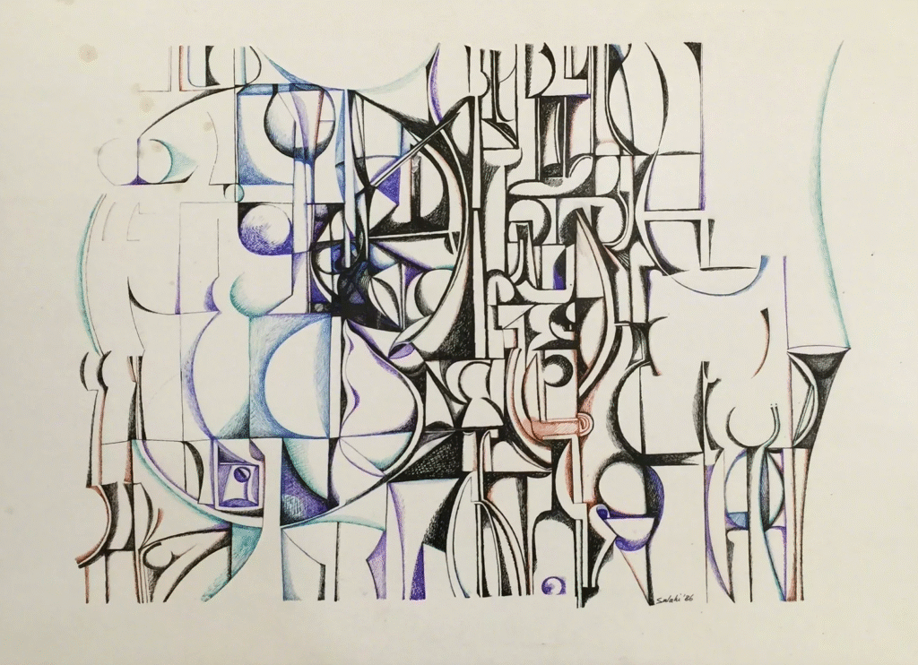 Alongside his artistic work, he served in public roles, including Director of Sudan’s Department of Culture and later as a cultural attaché in London. In 1975, his life shifted abruptly. He was imprisoned for six months without charge. During this time, he drew secretly on scraps of paper. These prison drawings changed his work permanently. The line became tighter. Forms fractured. Silence entered the page.