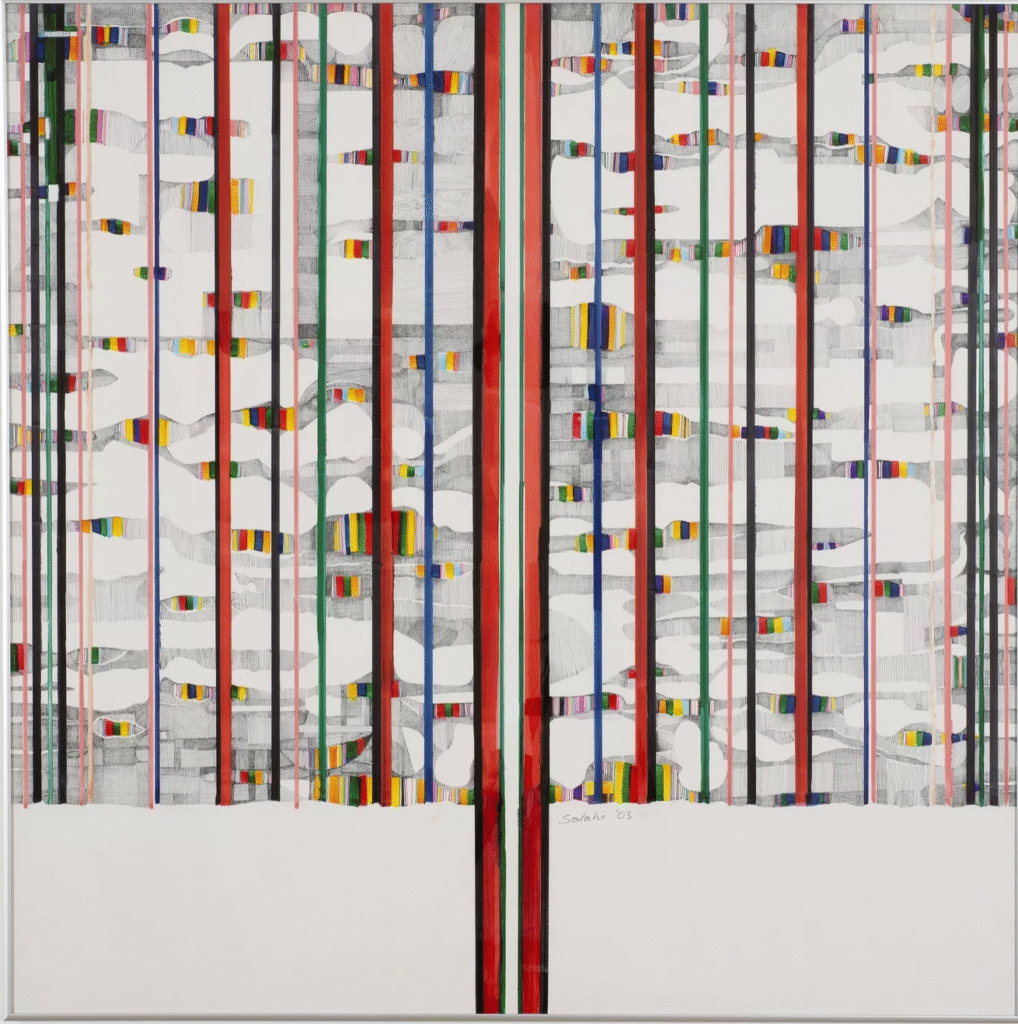 A key example is The Tree (2003). Executed in ink, the composition is built from fine, controlled lines that resemble script but never resolve into words. Branches and roots grow from calligraphic gestures. The tree does not describe nature; it records endurance. It is drawn from the memory of Sudan, of imprisonment, of survival. This is El-Salahi’s mature language: restrained, layered, and precise.